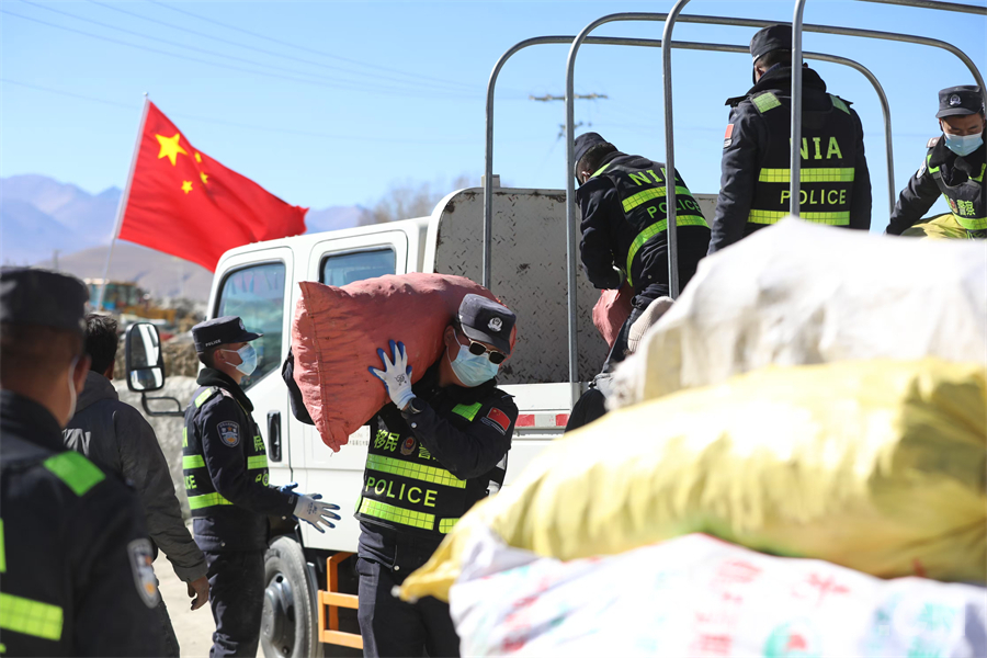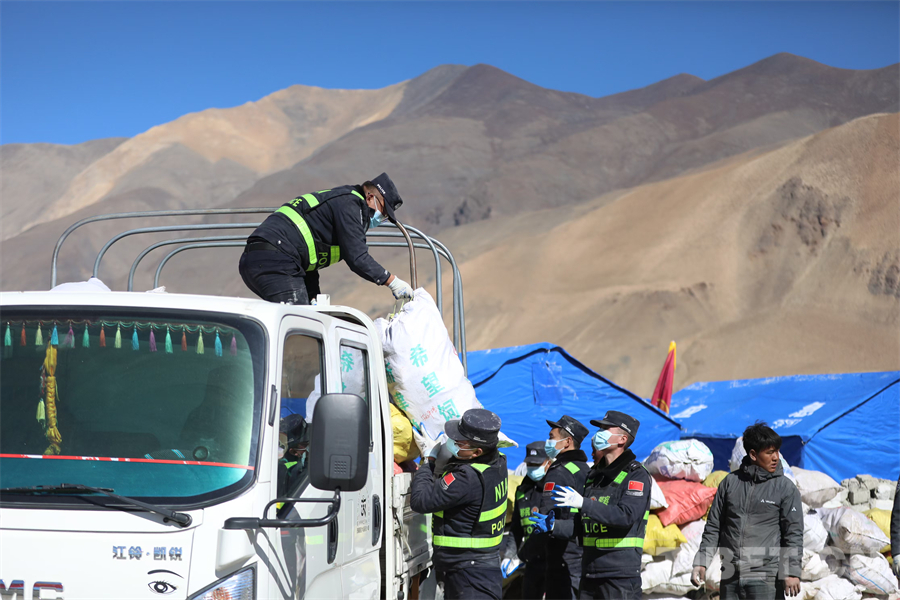 圖為西藏移民管理警察在定日縣長所鄉(xiāng)雜村為受災(zāi)群眾轉(zhuǎn)移物資 攝影:郭遠敬