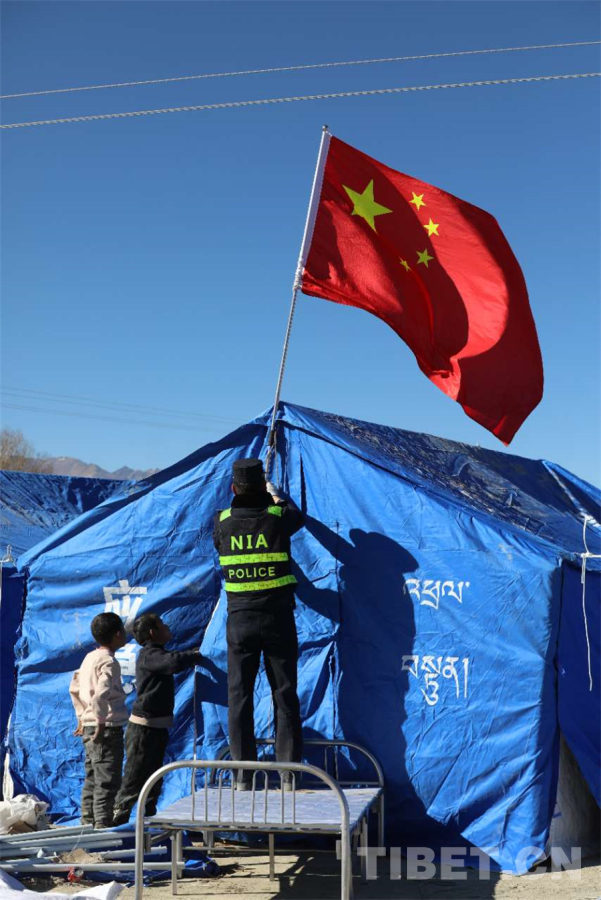 圖為西藏移民管理警察在定日縣長所鄉(xiāng)雜村受災(zāi)安置點懸掛五星紅旗 攝影:郭遠敬