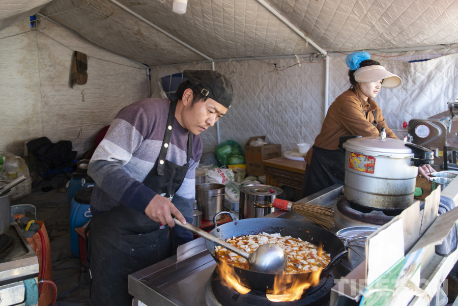 圖為在古榮村受災(zāi)群眾安置點,定日縣安多餐館的員工正在準(zhǔn)備免費提供的餐食 攝影:趙振宇