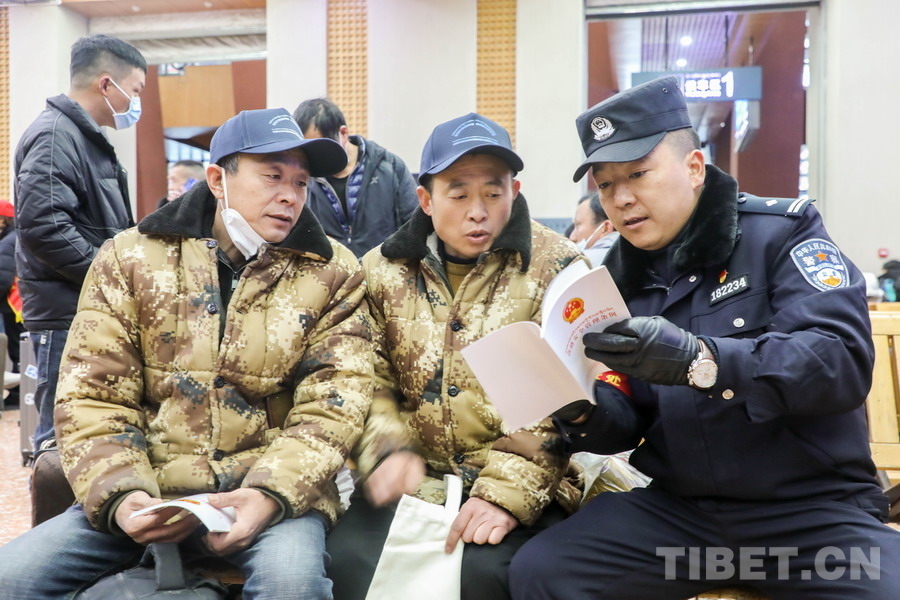 圖為春運(yùn)首日,西藏自治區(qū)司法廳聯(lián)合黨委政法委護(hù)路辦、拉薩鐵路公安處等單位在拉薩站區(qū)開(kāi)展普法宣傳活動(dòng)攝影:黃飛