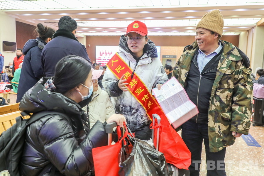 圖為西藏自治區(qū)司法廳人民調(diào)解宣傳員向在藏務(wù)工返鄉(xiāng)旅客講解相關(guān)法律常識(shí)攝影:黃飛