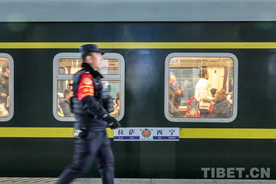 圖為春運(yùn)首日,拉薩站派出所民警普布在站臺(tái)巡視攝影:黃飛