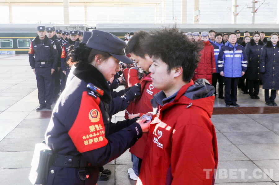 圖為拉薩鐵路公安處“格桑梅朵”女子乘務(wù)警組民警為西藏自治區(qū)團(tuán)委“天域”平安列車(chē)青年法制宣傳服務(wù)隊(duì)佩戴徽標(biāo)攝影:黃飛