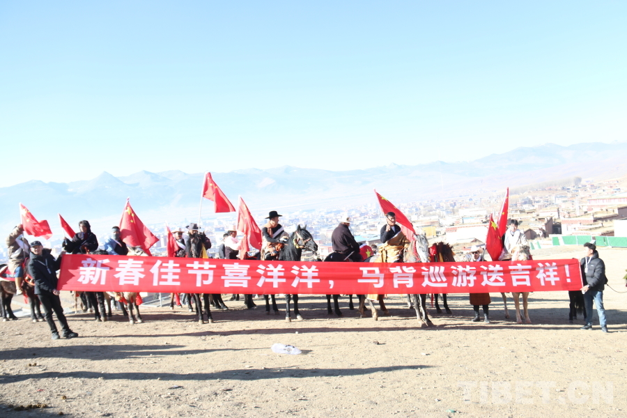 馬術(shù)巡游隊伍來到理塘東山頂上,俯瞰縣城全景,并展開祝福橫幅,用藏漢雙語高聲祝愿全國各族人民新春吉祥。