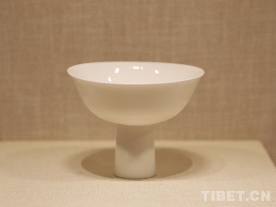 圖為明宣德青花五彩蓮池鴛鴦紋高足碗。經(jīng)鑒定,這只內(nèi)沿書(shū)寫(xiě)著藏文的高足碗是明代中央政府向薩迦寺賜送的實(shí)物見(jiàn)證 攝影:王茜