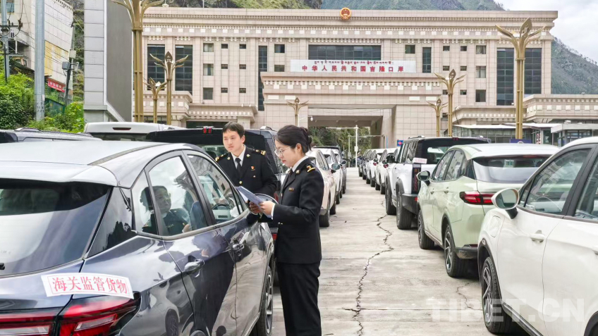 圖為海關(guān)工作人員在吉隆口岸對出口新能源汽車進行查驗 圖片由拉薩海關(guān)提供