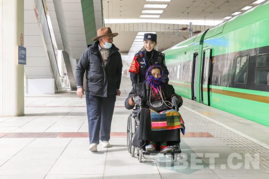 圖為乘警余丹措護(hù)送乘坐輪椅的旅客便捷乘車(chē)