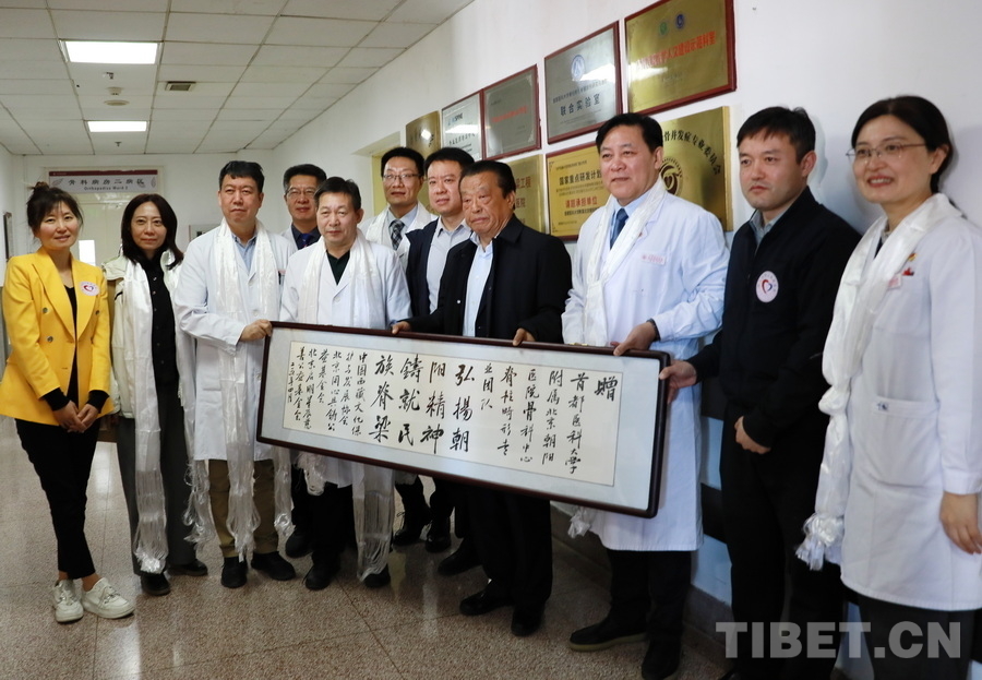 圖為中國(guó)西藏文化保護(hù)與發(fā)展協(xié)會(huì)、“同心·共鑄中國(guó)心”組委會(huì)、北京啟明星辰慈善公益基金會(huì)共同向北京朝陽(yáng)醫(yī)院贈(zèng)送牌匾 攝影:劉莉