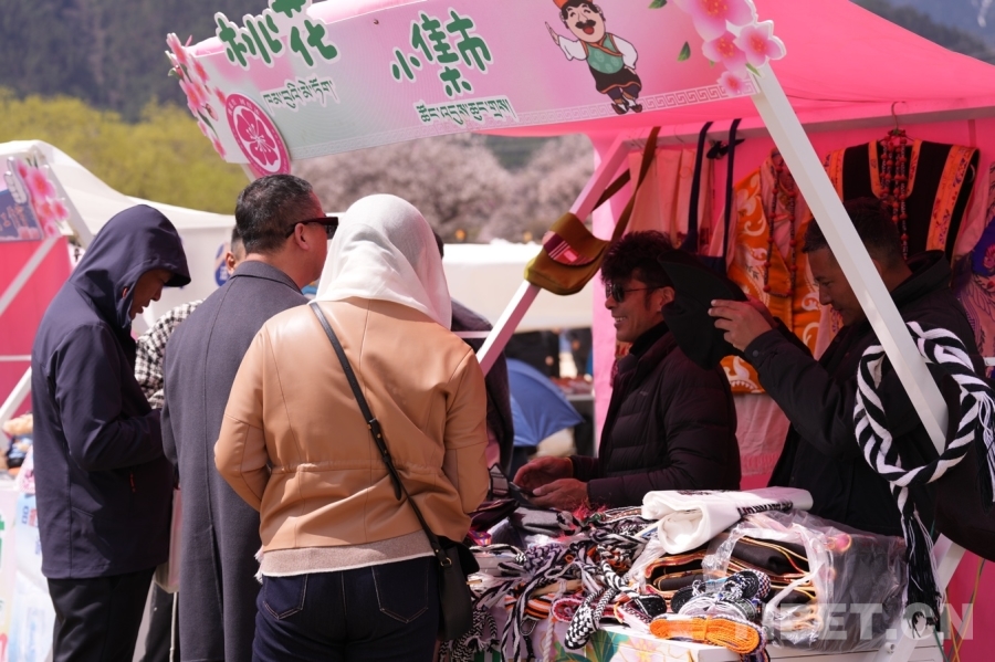 沿著蜿蜒的小路,一邊是錯(cuò)落有致的桃花樹,一邊是特色集市。“這些是工布男女服飾、這是馬套、這是藏式包包……都是我們合作社的工作人員手工制作的?!痹谖枧_(tái)一旁的桃花小集市,林芝市巴宜區(qū)絲綢藏裝定制農(nóng)牧民專業(yè)合作社負(fù)責(zé)人尼瑪扎西正向游客一一介紹自家展銷點(diǎn)的產(chǎn)品以及其背后的文化和制作過程。經(jīng)過一番討價(jià)還價(jià),一千余元的“大單子”順利成交,游客將一件件精美的巴宜“小禮品”裝進(jìn)袋子和尼瑪扎西揮手告別。