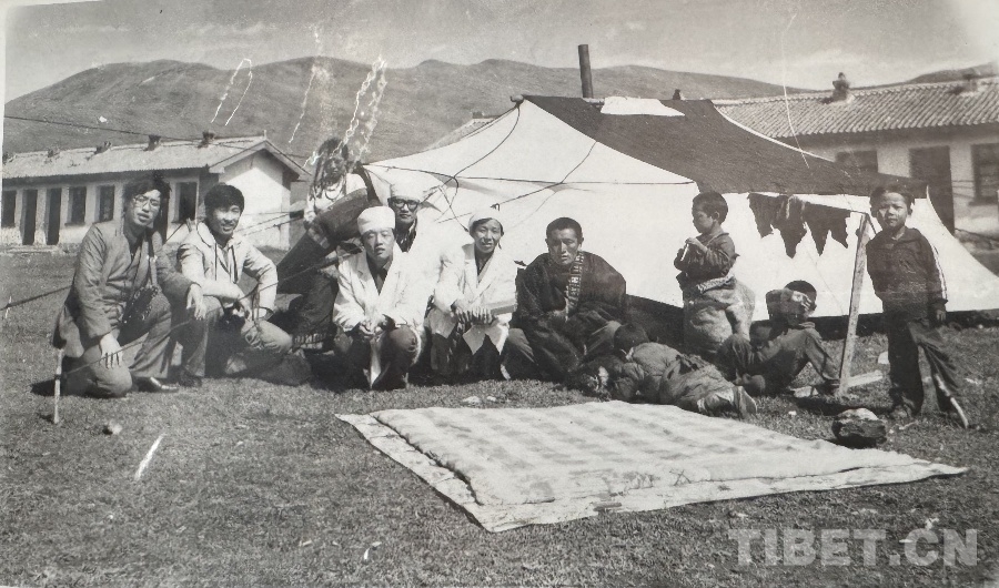 圖為20世紀80年代,王萬青(左五)和群眾在阿萬倉衛(wèi)生院內帳篷前的合影 翻拍:易文文