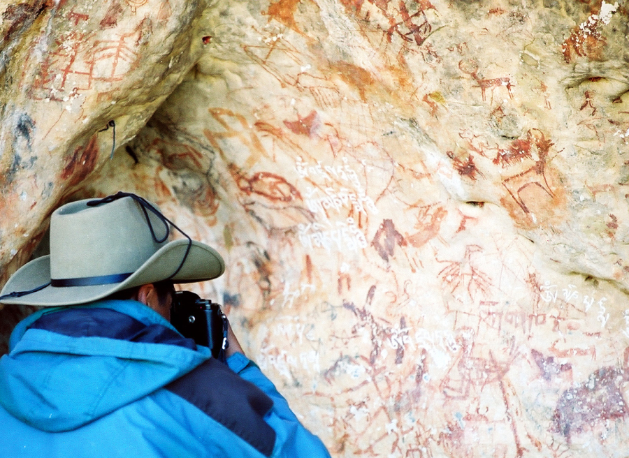 圖為科考人員在對納木錯扎西半島洞穴巖畫進(jìn)行考察拍照(唐召明2001年攝)
