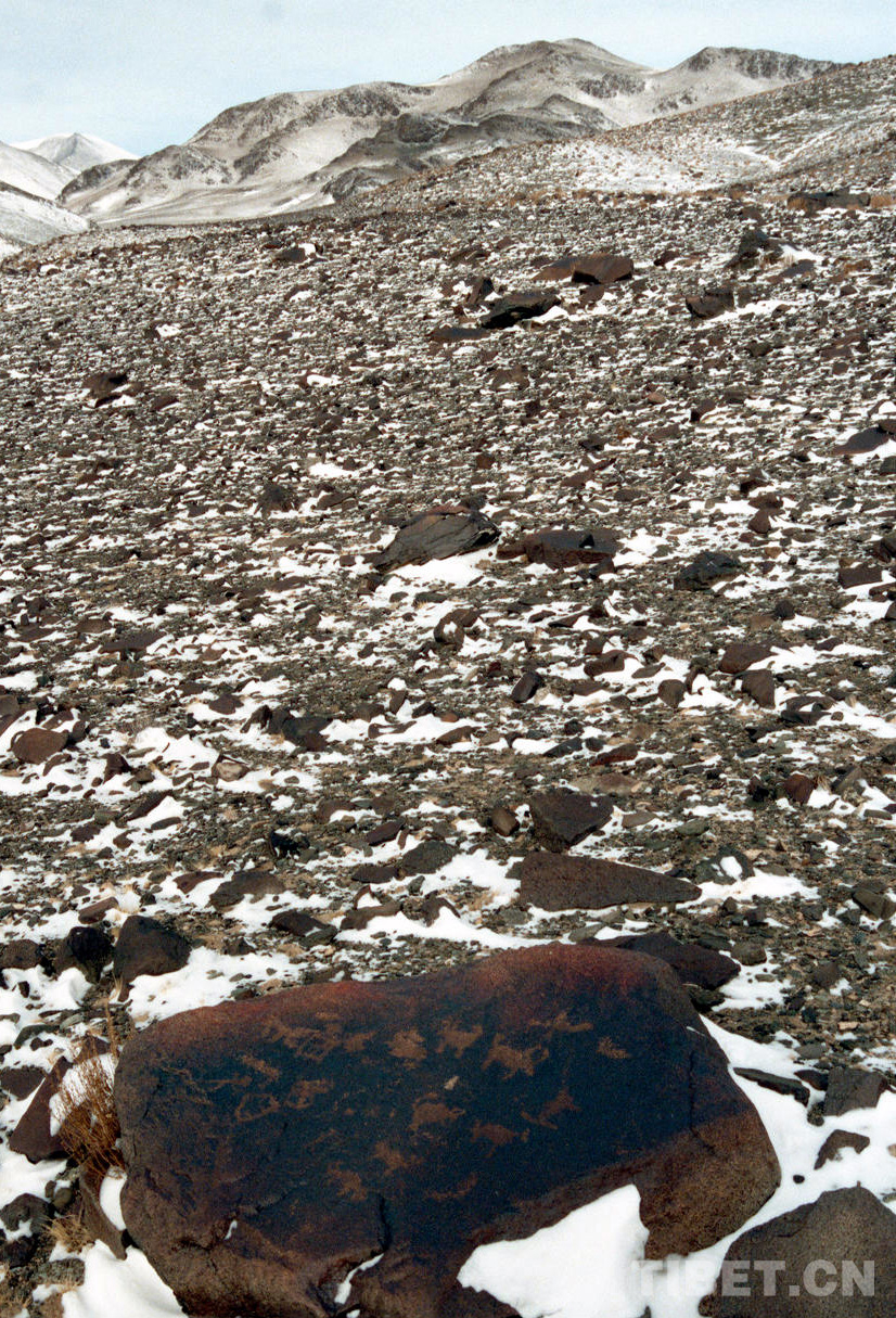 無獨(dú)有偶。在后來的幾天里,我們在那曲地區(qū)(現(xiàn)那曲市)尼瑪縣榮瑪鄉(xiāng)加林山俄東溝也發(fā)現(xiàn)了大量石頭巖畫。