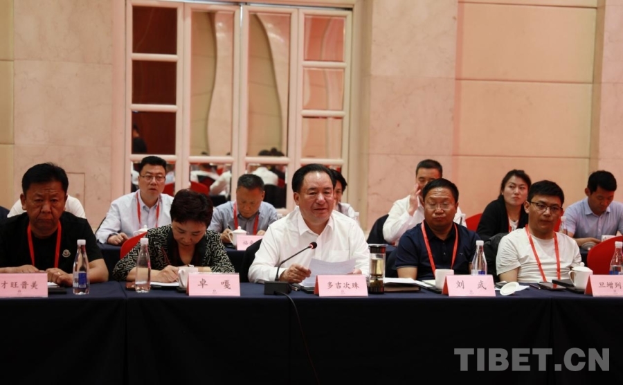 圖為西藏自治區(qū)政協(xié)黨組成員、副主席、區(qū)工商聯(lián)主席、總商會會長多吉次珠(前排左三)發(fā)言 攝影:劉莉