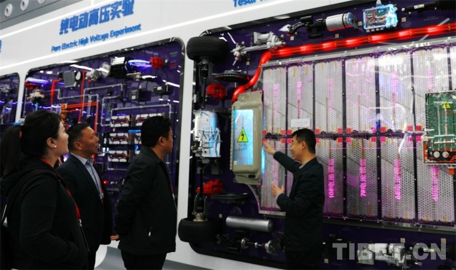 “這是由7104節(jié)電池組成的特斯拉的電池組,它是402伏的高壓電。所以,沒有經(jīng)過專業(yè)培訓(xùn)進(jìn)行電動(dòng)汽車維修會(huì)有一定的危險(xiǎn)性?!北狈絿?guó)際汽車教育展廳、車間負(fù)責(zé)人黨超為到訪的西藏自治區(qū)工商聯(lián)民營(yíng)企業(yè)家赴京學(xué)習(xí)參觀團(tuán)一行詳細(xì)介紹著墻上展示的電池組。大家聽得津津有味。