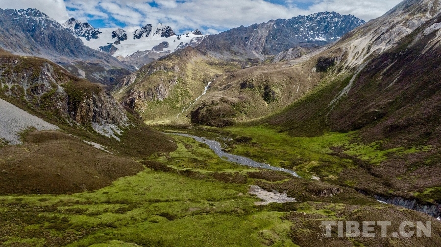 圖為2023年6月24日拍攝的甘孜州“海子山-格聶巖畫群”大環(huán)境,遠(yuǎn)處為格聶群峰