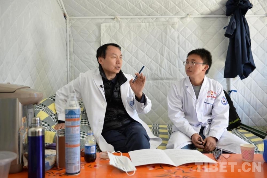 圖為2021年,余震中,王建六(左)帶領(lǐng)團隊赴青海省瑪多縣開展宮頸癌篩查,在帳篷辦公室里與當(dāng)?shù)蒯t(yī)務(wù)工作者交流 北京同心共鑄公益基金會供圖