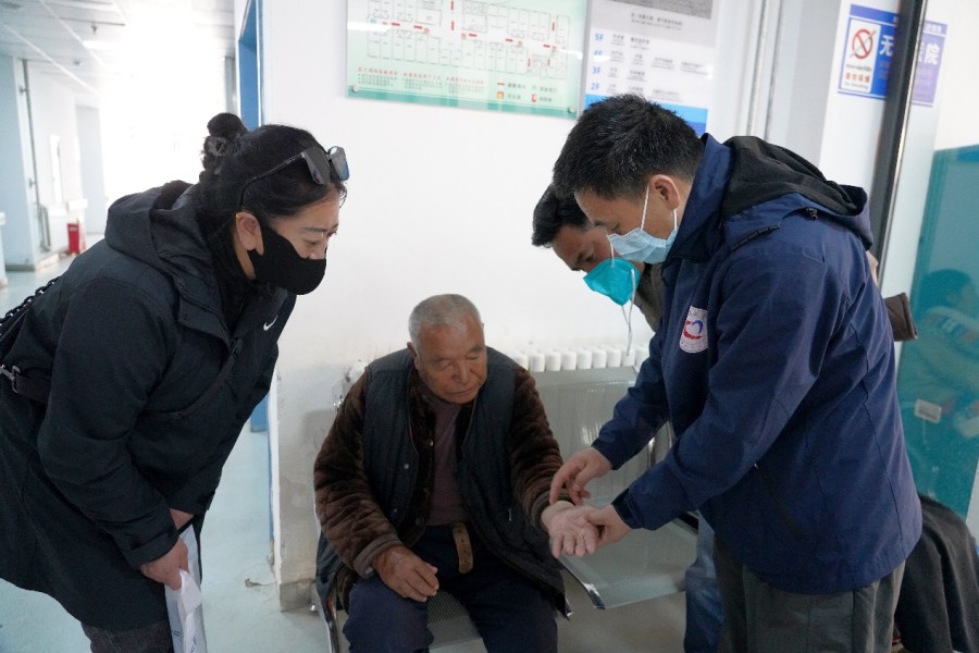圖為兩位專(zhuān)家正在為老人進(jìn)行診斷