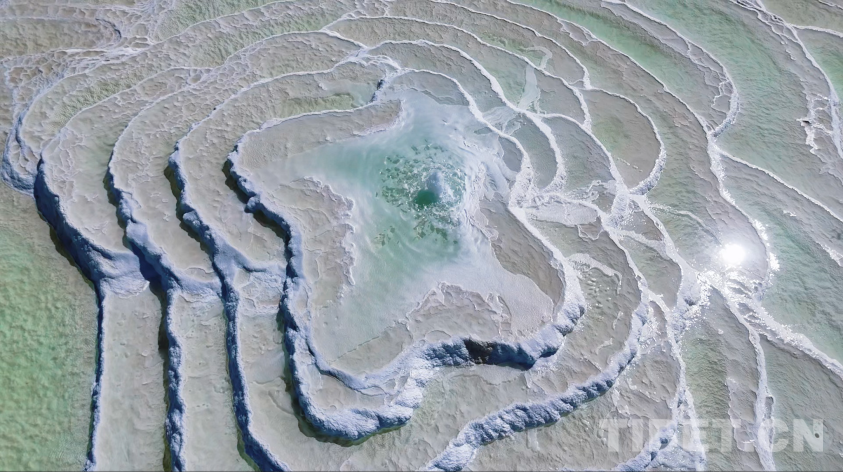 圖為察爾汗鹽湖內(nèi)的鹽池。在一些將要干涸的鹽池上,湖水表面會飄蕩著鹽花結(jié)晶,同時(shí)池底也會結(jié)晶為層層鹵石,這種鹵石的硬度很高,性質(zhì)也較為穩(wěn)定,足以修建成道路供行人車輛通行 供圖:青海省文化和旅游廳