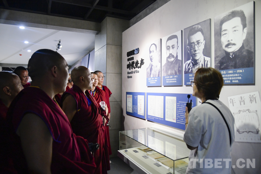 圖為在嘉興五四文化博物館內西藏佛學院師生認真聆聽關于五四運動的講解 攝影:趙振宇