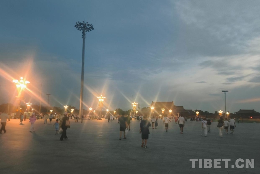 暑期的天安門廣場更加熱鬧,不僅有一家老幼同游的家庭,有旅行社帶來的各地旅游團,最多的是各種學(xué)校、團體組織的大大小小的學(xué)生團,他們身著不同顏色款式的服裝,共同等待著激動人心的時刻?!吧胶油}·京華筑夢”研學(xué)團的少年們便是其中一員,他們穿著淺藍色的T恤,戴著白色的棒球帽,散發(fā)著西藏少年的朝氣。