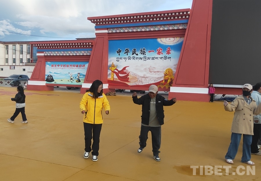 圖為在尼瑪縣民族團結(jié)進步主題廣場,筆者向扎西索朗學(xué)跳鍋莊舞 攝影:昂翁洛布