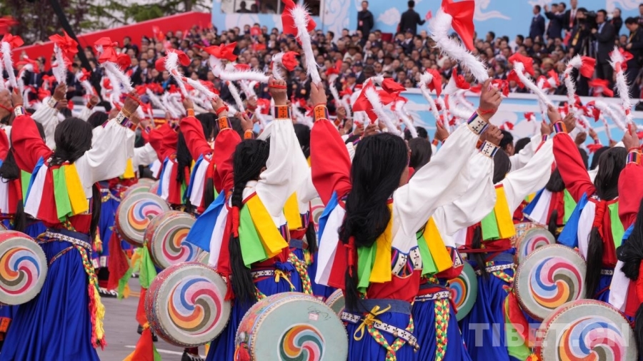 圖為慶祝大會現(xiàn)場充滿吉祥喜慶氣氛的盛大群眾游行 攝影:德吉卓瑪