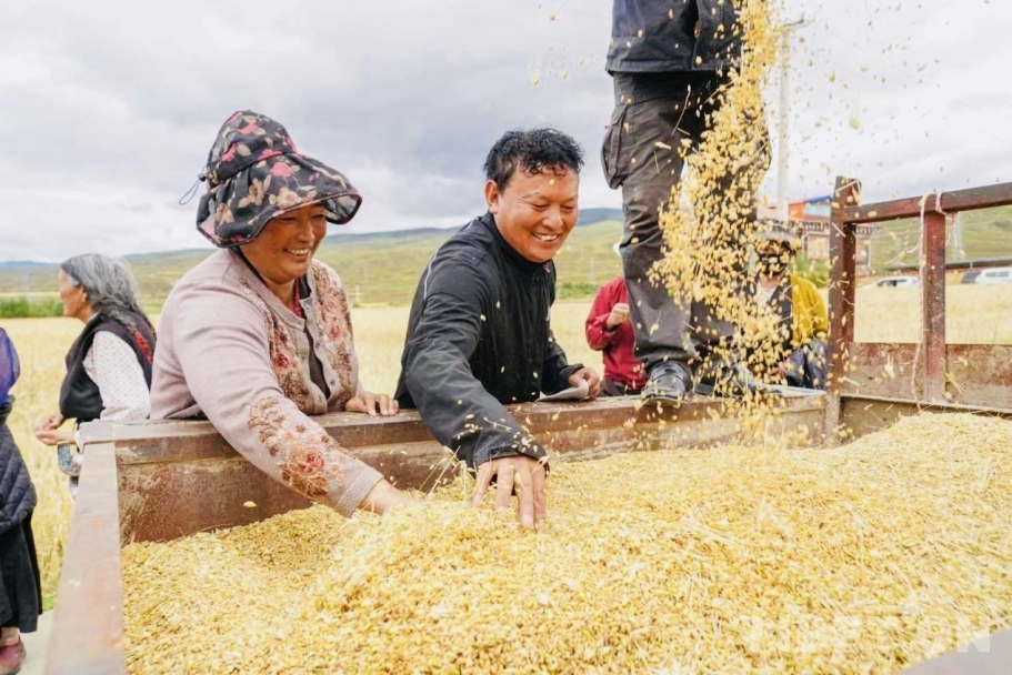 中國(guó)西藏網(wǎng)訊 8月29日,四川省甘孜藏族自治州甘孜縣拖壩鄉(xiāng)拖壩四村的500畝青稞基地里,收割機(jī)轟鳴作響,飽滿的青稞穗被整齊收割。甘孜縣12萬(wàn)畝青稞陸續(xù)成熟,高原上一片金黃。據(jù)甘孜縣農(nóng)牧農(nóng)村和科技局?jǐn)?shù)據(jù)顯示,今年全縣青稞預(yù)計(jì)總產(chǎn)量達(dá)27805噸,較去年增長(zhǎng)4.9%,再創(chuàng)歷史新高。