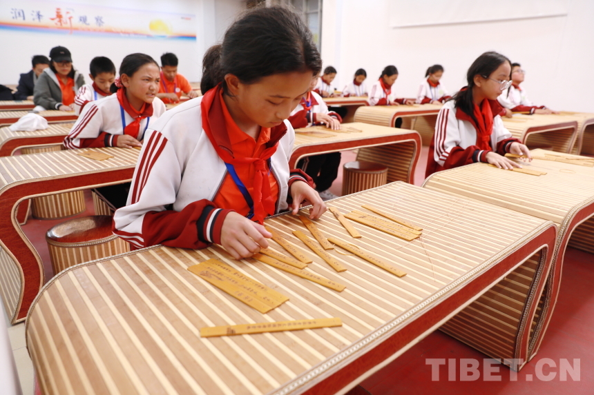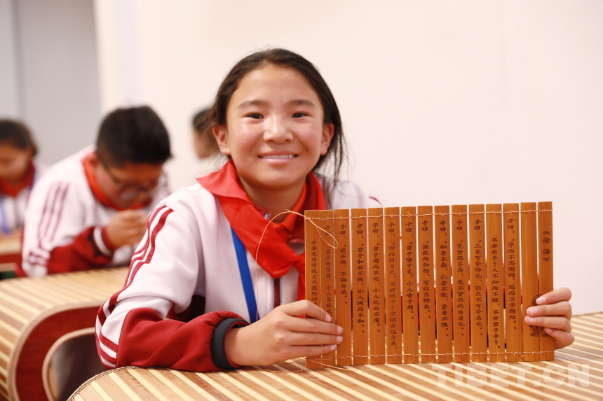 “子曰:‘學(xué)而不思則罔,思而不學(xué)則殆。’‘見(jiàn)賢思齊焉,見(jiàn)不賢而內(nèi)自省也。’‘知者不惑,仁者不憂,勇者不懼?!敝窈?jiǎn)手工課堂上,孩子們將打磨光滑的刻字竹片用牛筋線仔細(xì)編連成冊(cè)?!巴瑢W(xué)們要記住,繩子折疊后要保持長(zhǎng)度一致,位于竹簡(jiǎn)上方的繩子向上穿孔,下面的繩子向下穿孔而過(guò),這樣能保證竹片緊密相連,即‘上上下下’原則?!痹诶蠋熛ば牡闹笇?dǎo)與幫助下,孩子們稚嫩的雙手上下翻飛,很快便將散落的竹簡(jiǎn)按照刻字排列整齊,并編織成冊(cè)。來(lái)自阿里噶爾縣昆莎鄉(xiāng)的巴桑卓瑪說(shuō)道:“編竹簡(jiǎn)需要繩子不斷交織,與藏族的紡織工藝有些相似。通過(guò)這次手工,我感受到了古人的智慧與中國(guó)傳統(tǒng)文化的神奇奧秘?!闭窍裰窈?jiǎn)、紙張一樣的文化載體,才讓先賢哲人的深邃智慧以文字的形式流傳至今,被千年后的人們傳承誦讀。