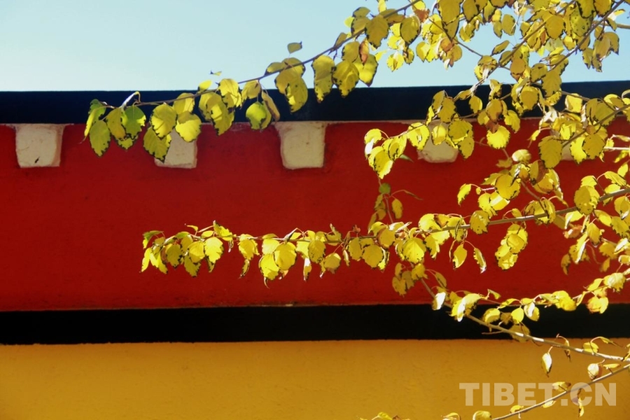 圖為阿里獅泉河鎮(zhèn),紅墻藍(lán)天黃葉相得映彰 攝影:趙釗