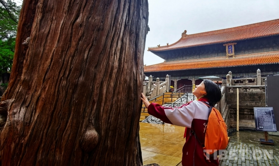 圖為西藏阿里噶爾縣孔繁森小學(xué)學(xué)生在山東曲阜孔廟大成殿外用手感受殿外參天古柏 攝影:劉莉