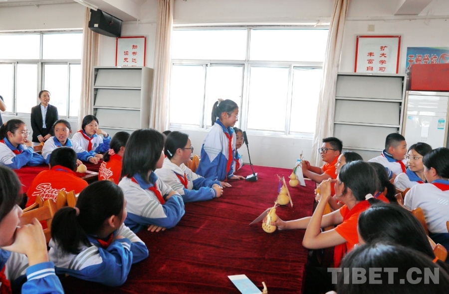 圖為山東聊城堂邑鎮(zhèn)中心小學(xué)學(xué)生向西藏阿里噶爾縣孔繁森小學(xué)的小伙伴贈送并介紹媽媽親手制作的向日葵小擺件 攝影:劉莉