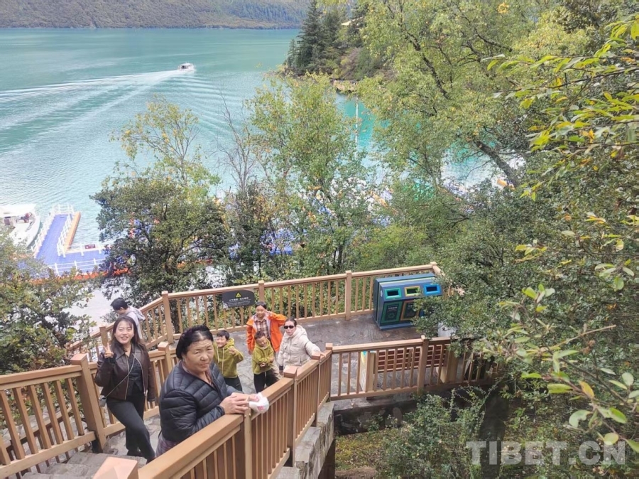 圖為雙節(jié)期間游客在巴松錯拍照留念 攝影:仁增