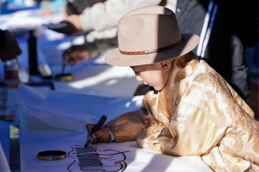 圖為參加匯報展的孩子在書寫藏文 主辦方供圖
