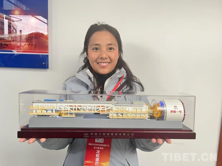 圖為西藏基層干部學(xué)習(xí)參觀團領(lǐng)隊次旺德巴展示“津城一號”盾構(gòu)機模型 攝影:王茜