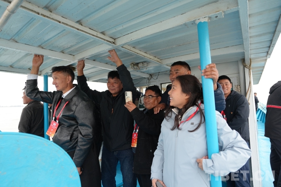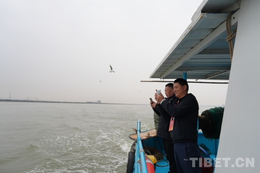 圖為西藏基層干部學(xué)習(xí)參觀團成員在甲板上觀看捕魚 攝影:王茜