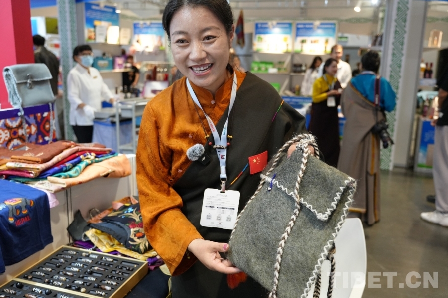 圖為周永拉毛正在展示藏族風格挎包 攝影:楊柳青