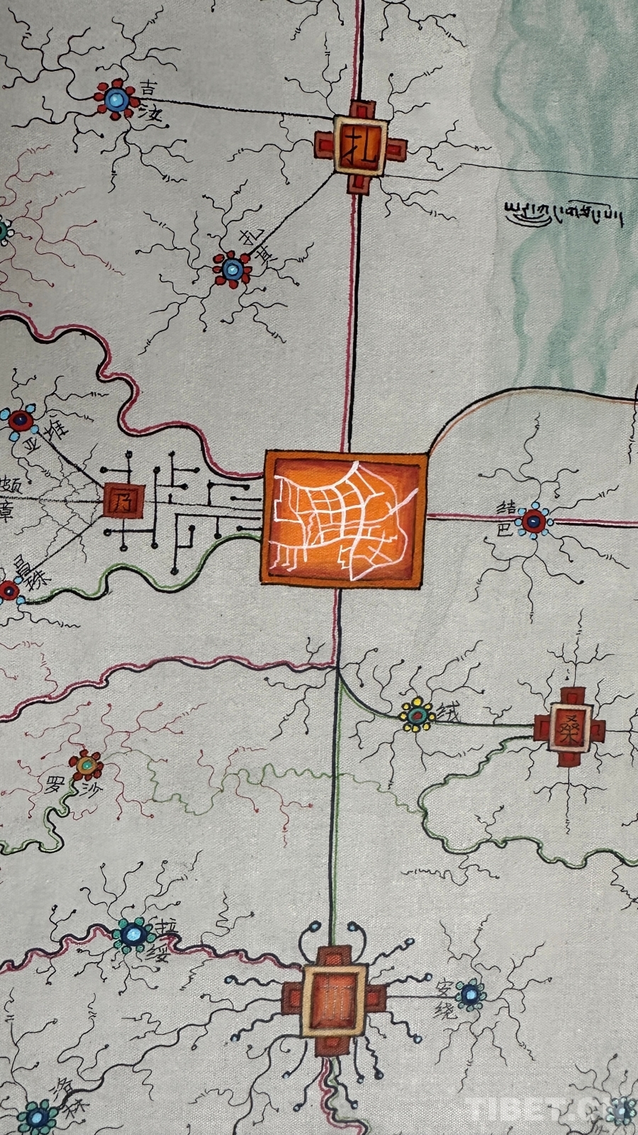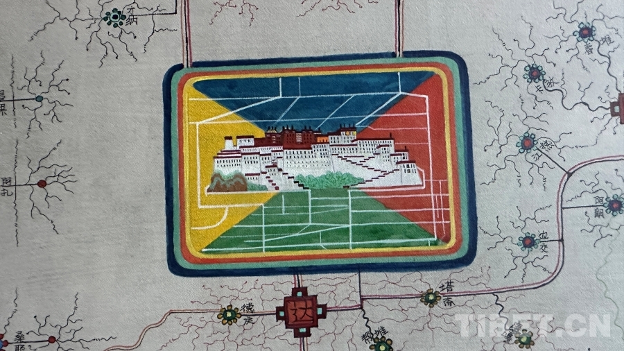 達(dá)布詳細(xì)解釋了這幅唐卡的圖像系統(tǒng):正方形代表市、區(qū),內(nèi)部畫有該市區(qū)主干道地圖;十字方形代表縣;圓形寶石形代表鄉(xiāng)鎮(zhèn);藏文“嗡”字代表名勝古跡;此唐卡以黑線為所有公路基礎(chǔ)線,黑線邊上的紅黃線代表國(guó)道和高速,綠線代表省道,黑細(xì)線代表縣鄉(xiāng)鎮(zhèn)及村級(jí)公路。沿途還繪制了珠峰、古格王國(guó)遺址、納木錯(cuò)等代表性景點(diǎn),并用藏文標(biāo)注名稱。