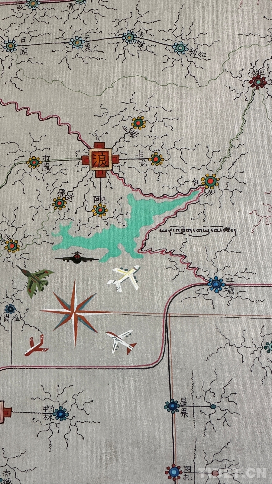 作為一件與地圖密切相關(guān)的作品,達(dá)布主要依據(jù)公路主線和國(guó)家公布的行政區(qū)域進(jìn)行描繪,對(duì)于一些在常用地圖上無法精確定位的地名,采取了審慎態(tài)度。達(dá)布還追溯了西藏的地圖繪制傳統(tǒng),認(rèn)為可以從著名的《西藏鎮(zhèn)魔圖》開始算起。然而,創(chuàng)作中的挑戰(zhàn)并沒有阻礙他的創(chuàng)作熱情?!爱嬛@幅畫,我覺得這是一個(gè)普通唐卡畫師用畫筆感恩當(dāng)下,是對(duì)歷史的真實(shí)記錄,對(duì)偉大工程成果的贊揚(yáng),也是對(duì)傳統(tǒng)唐卡表現(xiàn)形式的突破和思考?!?nbsp;