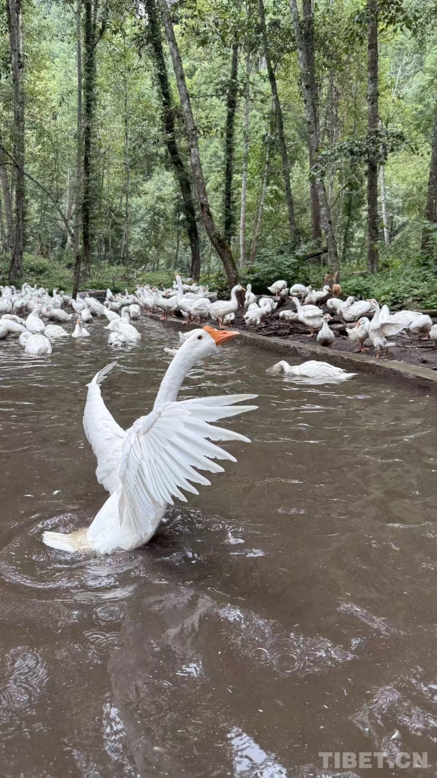“嘎嘎——!”清晨,察隅的山霧還沒(méi)散盡,上察隅鎮(zhèn)珠聯(lián)村的山林間,上千只大白鵝已經(jīng)吵成一片。這些圓滾滾的“白團(tuán)子” ,或撲棱著翅膀在水塘中嬉戲,引吭高歌;或憨態(tài)可掬地在林間來(lái)回踱步,啄食雜草……把這個(gè)2024年10月才成立不久的搬遷新村,攪得熱鬧非凡。