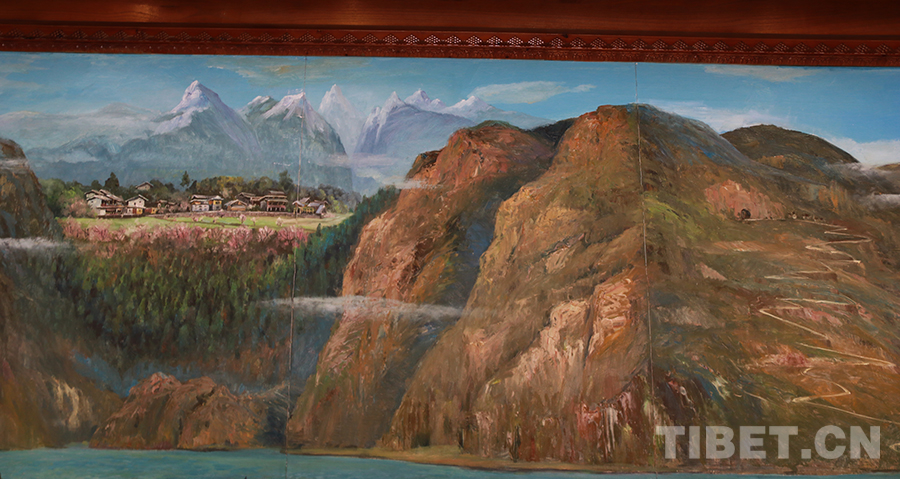 圖為色龍村內(nèi)建筑上的壁畫,生動描繪了色龍村所處的特殊地理條件,右邊的盤山公路蜿蜒通過隧道之后而有左邊的“桃花源” 攝影:王妍丹