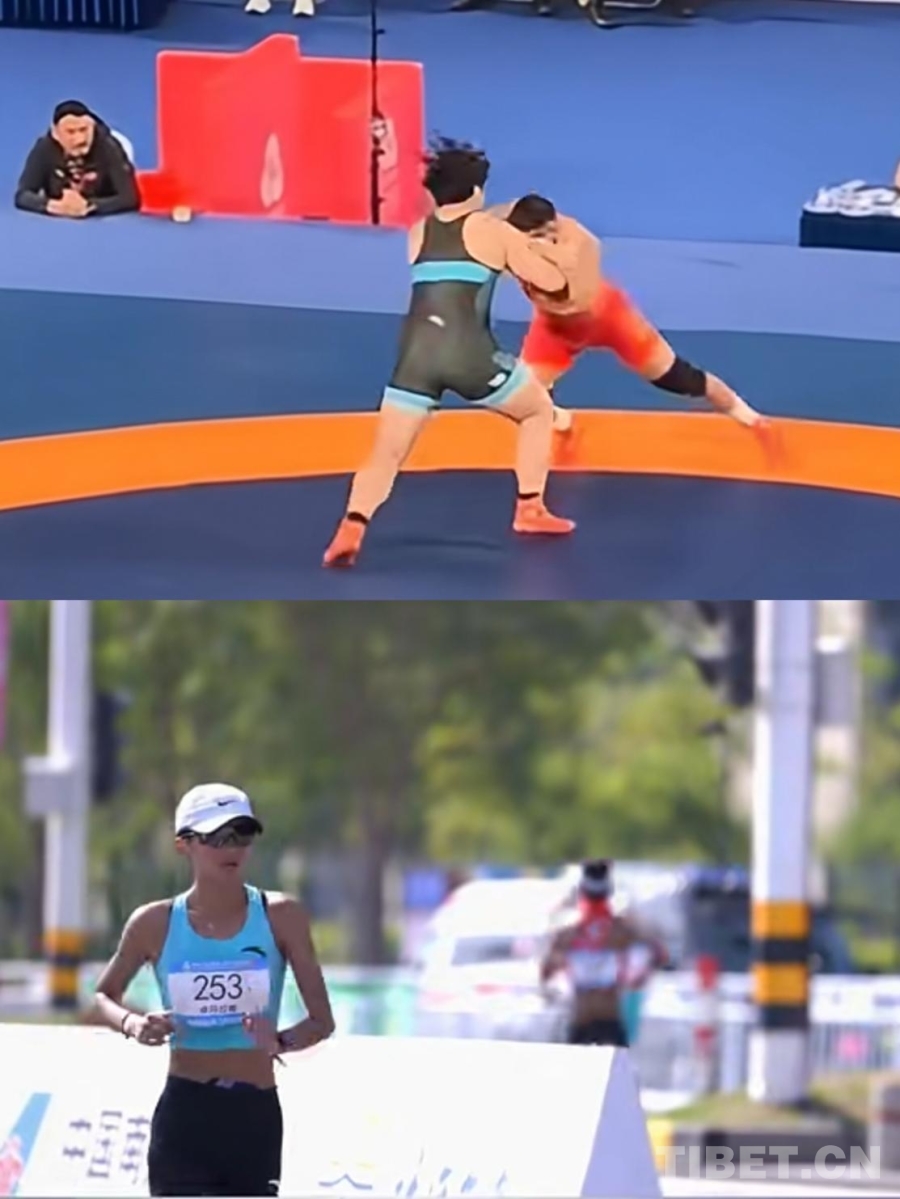 視頻截圖為西藏摔跤運動員洛松西繞(上)和競走運動員卓瑪拉姆(下)在比賽中
