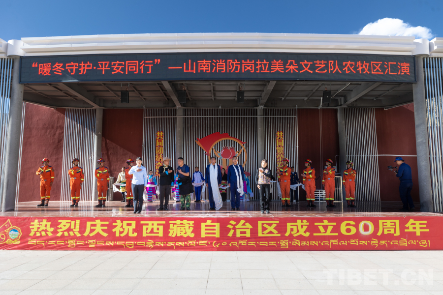 圖為山南市消防救援支隊崗拉美朵文藝隊“農(nóng)牧區(qū)暖冬消防行”巡演首演現(xiàn)場