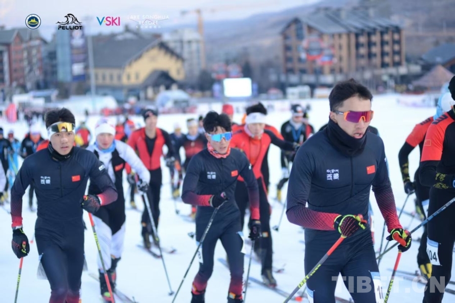 圖為西藏運(yùn)動(dòng)員正進(jìn)行激烈的滑雪比賽