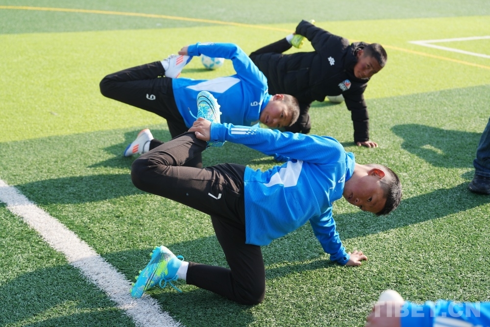 盡管正值寒冬,西藏的足球少年們已經(jīng)迫不及待地?fù)Q上球服開始跑動(dòng)熱身。帶隊(duì)教練和球員們圍成圓圈,團(tuán)抱在一起,大喊加油!