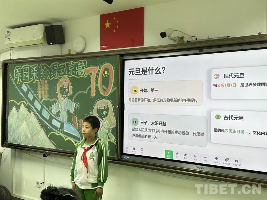 為了歡迎遠(yuǎn)道而來的藏族小伙伴,翠微小學(xué)全體師生精心籌備了以“石榴花開別樣紅,民族團(tuán)結(jié)一家親”為主題的系列交流活動(dòng)。30日上午,一場特殊的聯(lián)合隊(duì)會(huì)拉開了深入交流的序幕。在隊(duì)會(huì)上,兩地孩子相互佩戴紅領(lǐng)巾、敬獻(xiàn)潔白哈達(dá),以最莊重又親切的禮節(jié)表達(dá)彼此間的尊重與祝福。大家共同觀看回顧雙方從寫信相識(shí)到奔赴北京、準(zhǔn)備禮物、期待相見的溫情短片,聆聽關(guān)于漢族元旦節(jié)日習(xí)俗和藏民族游牧文化的生動(dòng)介紹,在增進(jìn)了解中深化認(rèn)同。