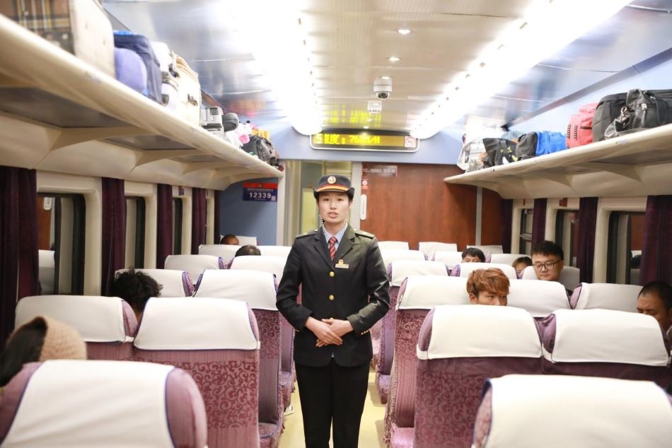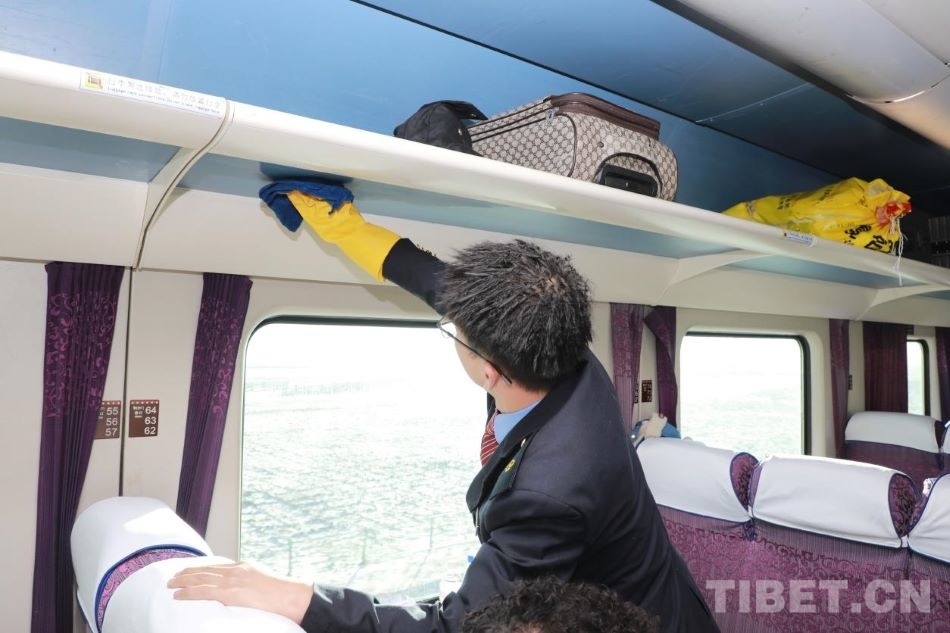 圖為乘務(wù)員在打掃車廂衛(wèi)生 攝影:陳衛(wèi)國