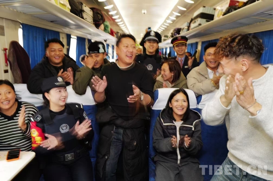 圖為列車車廂內(nèi),乘警與返鄉(xiāng)學子載歌載舞,悠揚的歌聲在“天路”之上回蕩,讓返鄉(xiāng)歸途暖意融融