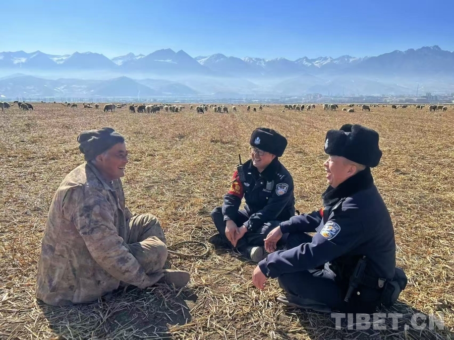 圖為祁連山腳下門源車站,青藏鐵警向當?shù)厝罕娒鎸γ嫘v鐵路安全知識,共筑平安防線