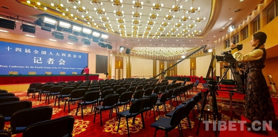 中國西藏網(wǎng)記者正在拍攝2026年全國兩會新聞中心工作人員布置新聞發(fā)布廳 攝影:劉莉