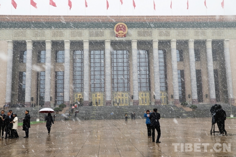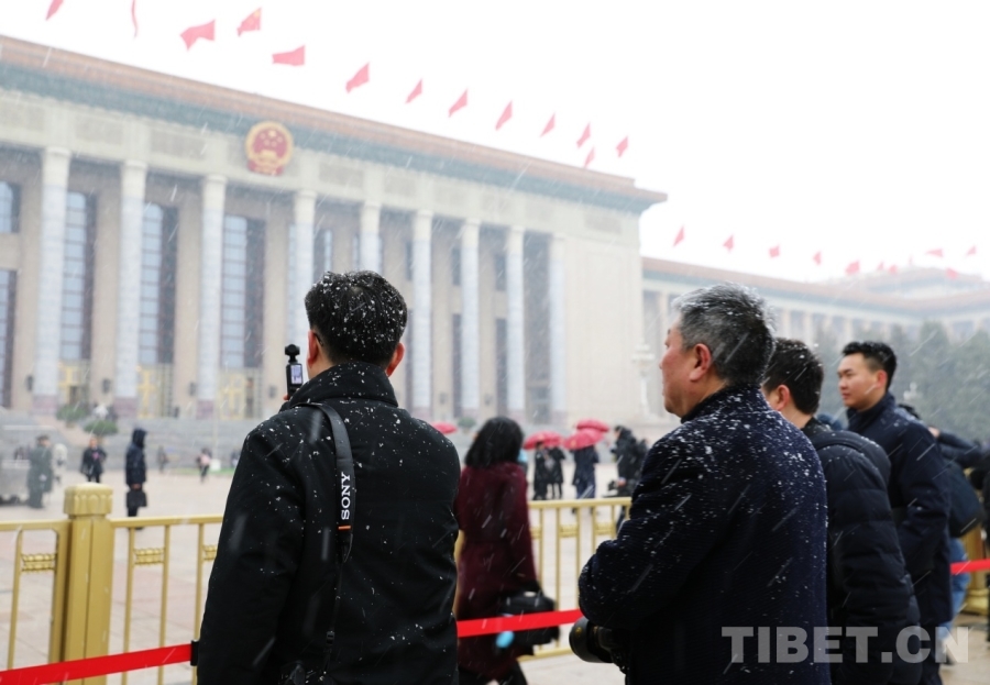 3月4日上午,十四屆全國(guó)人大四次會(huì)議舉行預(yù)備會(huì)議。會(huì)議結(jié)束后,一場(chǎng)春雪不期而至。在紛揚(yáng)的大雪中,康巴衛(wèi)視記者正在工作。攝影:劉莉